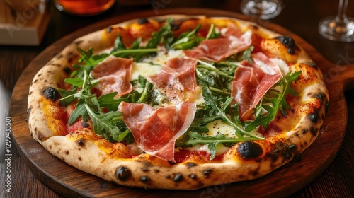 Artisan wood-fired pizza with truffle oil, arugula, and prosciutto.