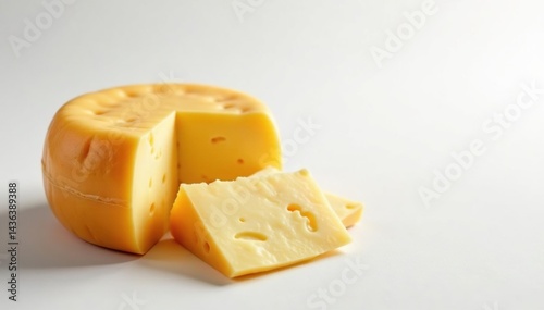 Artisanal cheese wheel, pristine white backdrop, mozzarella, dairy product