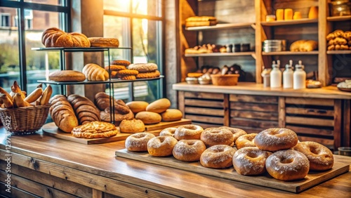 Artisanal donuts and freshly baked bread displayed on a wooden counter in a cozy bakery shop with soft natural light pouring in from large windows , soft natural light, freshly baked bread
