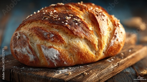 Artisanal Loaf Displayed on Rustic Wooden Cutting Board, a close up view