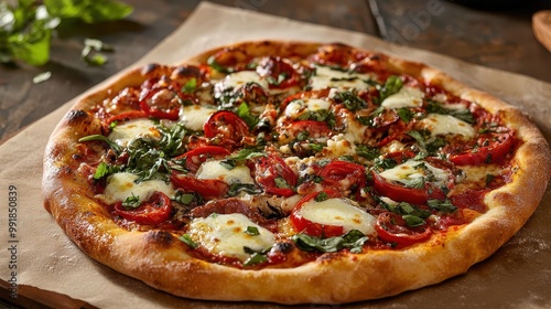 artisanal pizza creation showcasing a perfect blend of colors and textures woodfired crust with bubbling cheese vibrant toppings and aromatic herbs captured in mouthwatering detail