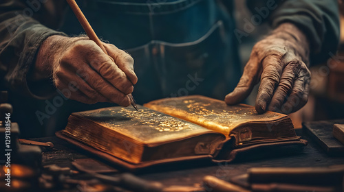 Artisan's Craft: Capturing the essence of artistry, an artisan meticulously embellishes the pages of an aged book, each stroke imbued with precision and care.