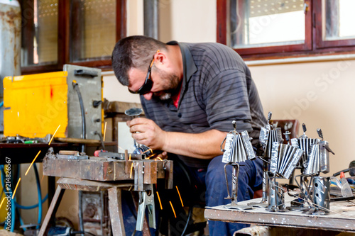 Artist is making figure by welding few metal wires in his workshop, barehanded