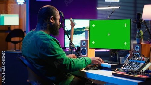 Artist plays midi controller synthesizer next to green screen layout, working on producing new music with his audio musical instruments in home studio. Musician using isolated copy space. Camera A.