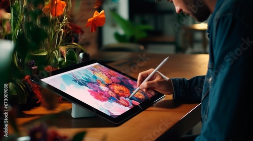 Artist using a digital tablet device for drawing or graphic design, AI-generated.