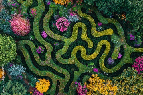 Artistic aerial shot of a whimsical garden maze, with intricately shaped hedges and vibrant flower beds forming a colorful labyrinth.