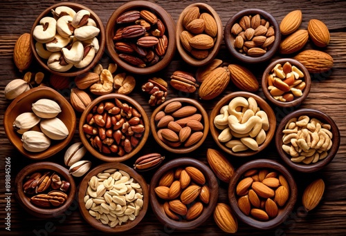 artistic arrangement assorted nuts displayed rustic wooden platter varied textures colors, healthy, snacks, gourmet, food, organic, almonds, cashews, walnuts
