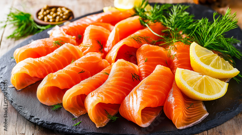 Artistic Arrangement of Thinly Sliced Salmon Gravlax on Slate Platter for Elegant Culinary Inspiration