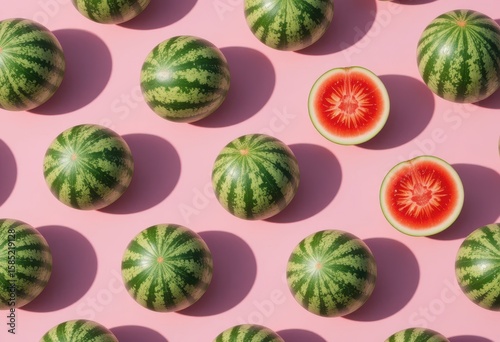 Artistic arrangement of watermelons and slices on a pink backdrop creating patterns