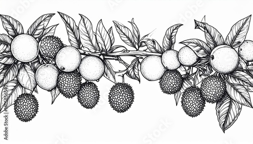 Artistic Black and White Drawing of a Branch with Fruit and Leaves for Decoration