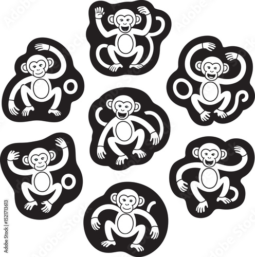 Artistic black and white illustration featuring playful monkey characters in various dynamic poses on a white background