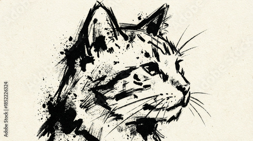 Artistic black ink painting of a cat head with expressive ink splatters