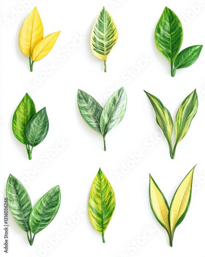 Artistic botanical arrangement of colorful leaves on white background capturing nature's beauty and freshness in a minimalist style for stock photography