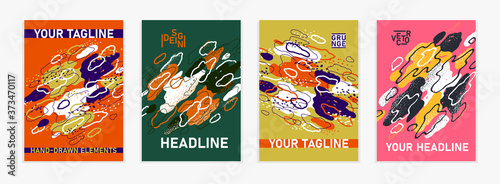 Artistic brochures vector abstract designs set with hand drawn elements, stylish colorful art abstraction covers for magazines or flyers, leaflets or advertising posters templates collection.
