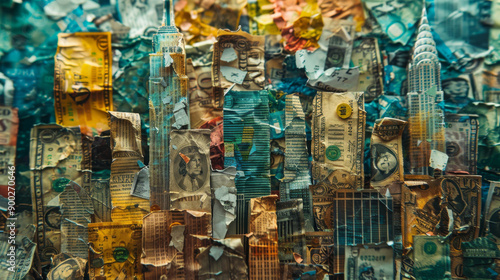 Artistic collage of various currency notes arranged to resemble a bustling city skyline with skyscrapers.