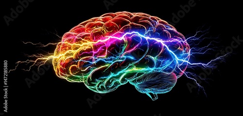 Artistic colorful illustration of human brain energy activity and neurological processes