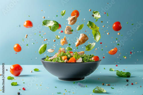 Artistic composition of a vegetable salad with pieces of chicken, tomatoes, and herbs suspended in the air