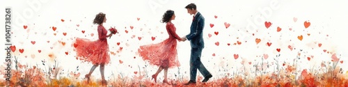 Artistic depiction of a couple in love surrounded by red hearts and flowers, with a woman holding a bouquet nearby.