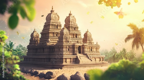 Artistic depiction of Mahabalipuram shore temple with festive Tamil Nadu Day elements and colors