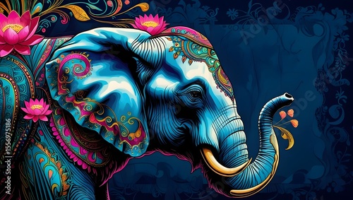 Artistic Elephant in bloom: A vibrant, digitally crafted elephant is adorned with ornate, colorful patterns and delicate flower elements, all set against a captivating deep blue backdrop.