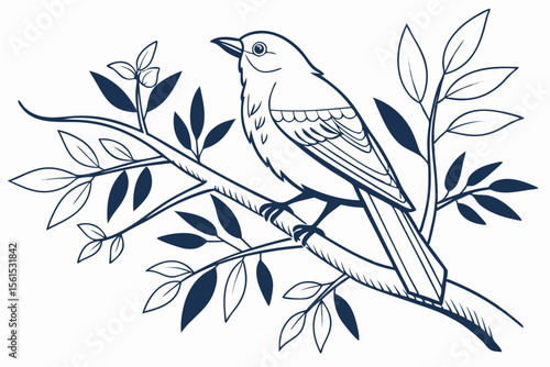 Artistic illustration of a bird resting on a leafy branch