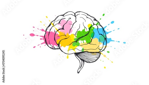 Artistic illustration of a human brain with colorful paint splatters representing creativity, thoughts, and emotions.