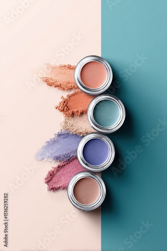 Artistic illustration of eyeshadow color swatches in playful arrangement with clean design and copy space