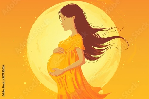 Artistic illustration of serene pregnant woman in flowing orange dress, standing against glowing moon backdrop. Her gentle pose and vibrant, warm colors evoke sense of peace, beauty of motherhood