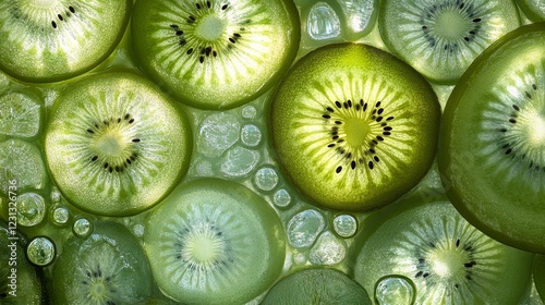 artistic kiwi fruit composition, luminous green circular slices, intricate natural mandala patterns, crystalline fruit texture, backlit organic matter, botanical macro photography, fresh produce
