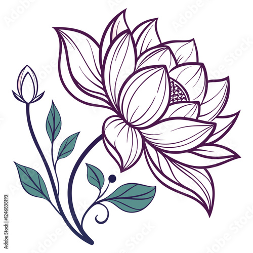 Artistic lotus flower illustration showcasing depth and complexity with overlapping petals and a green leafy backdrop
