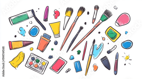 Artistic materials doodles with brushes, palettes, and paint for graphic design resources