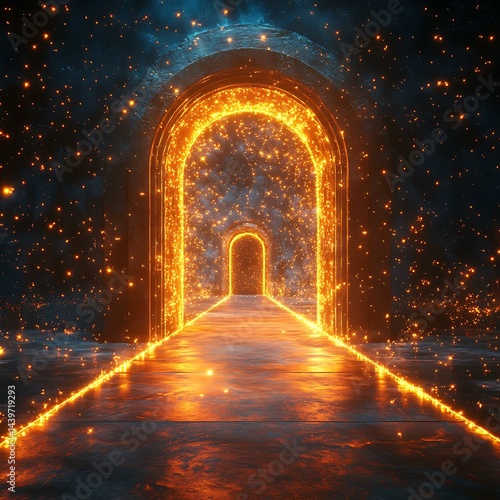 Artistic path of festive light leading to a glowing vault door symbolizing breakthrough to financial independence and opportunity Wealth and Abundance Mindset Smart Investment Journey
