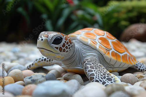 Artistic portrait of a colorful turtle with vibrant shell on natural rocks background