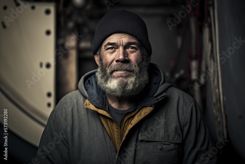 Artistic portrait of a humble smiling bearded fisherman from Iceland. Person created by AI generative.