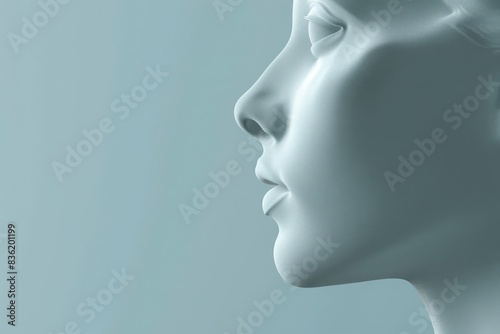 Artistic profile of a serene female face in soft blue monochrome, emphasizing calm and introspective mood with subtle elegance.