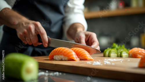 Artistic Representation of a Sushi Chef in the Process of Creating a Masterpiece with Fresh Ingredients