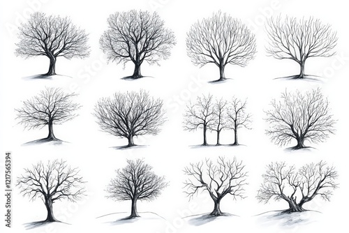 Artistic representation of diverse tree silhouettes showcasing seasonal changes and unique shapes