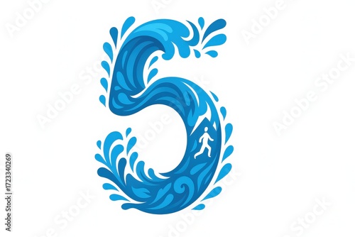 Artistic Representation of the Number Five as a Creative Aquatic Design with Playful Waves and a Runner Silhouette Embodying Movement and Energy