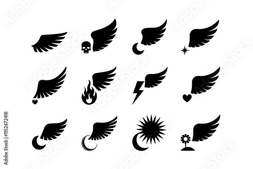 artistic set of various wing silhouettes representing freedom, dreams, and spirituality in a minimal black vector style