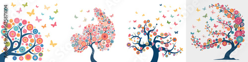 Artistic Trees with Circular Designs and Butterflies Colorful Illustrations on White Background Collection