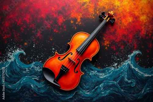 Artistic Violin Painting Style, Orange Blue Red, Music And Emotion Concept