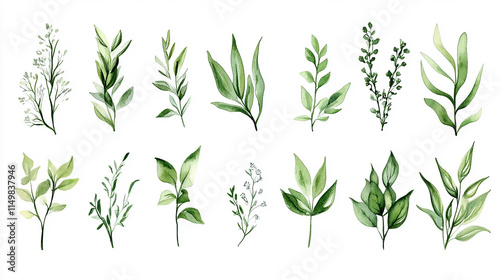 Artistic watercolor collection of foliage plants with intricate detailing, each isolated in a thin frame, against a luminous white background a collection of botanical art and design elements