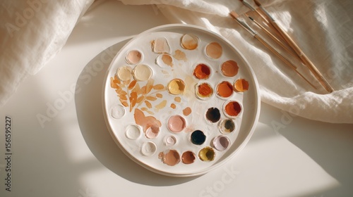 Artistic watercolor palette with various colorful paints and brushes on white fabric.