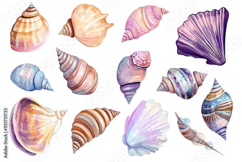 Artistic Watercolor Seashell Collection Featuring Soft Tones, Detailed Marine Life, and Waves