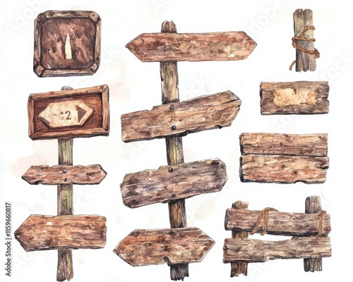 Artistic Watercolor Signpost Ensemble. Handcrafted Wooden Panels with Vintage Charm for Tour Guidance