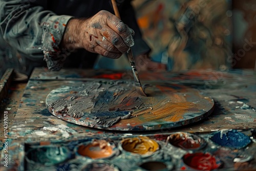 Artist's hand mixing paint on palette.