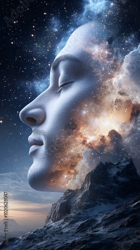 As his face blends into the sky, he dreams of worlds far beyond the earthly realm.