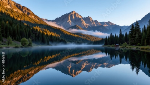 As the early morning light filters through the dense forest, casting a golden glow across the mist shrouded lake