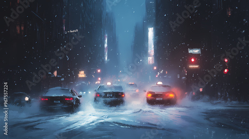 As the night falls the snowstorm intensifies making it seem as though the cars are slowly vanishing into the snowcovered cityscape. Snowstorm. Illustration