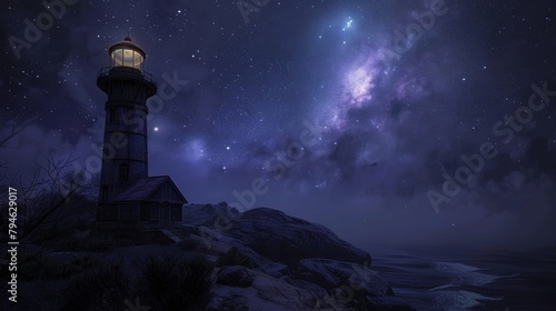 As the stars le in the night sky the only thing to keep you company in this secluded lighthouse is the rhythmic lullaby of the ocean. 2d flat cartoon.